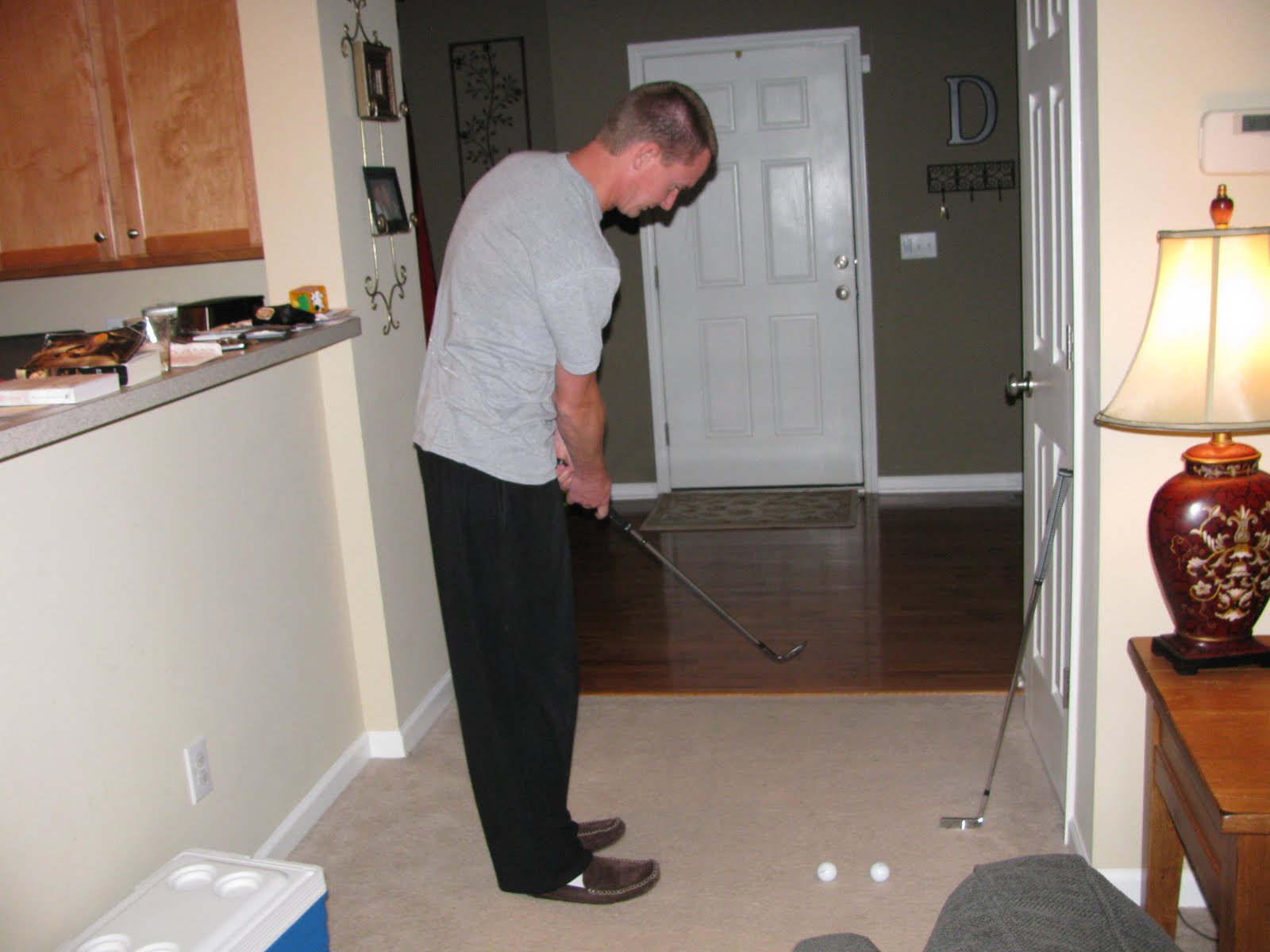 Matt wants this child to play golf so bad he can't stand it. He bought Chase his first golf club last Christmas and I had to gently remind him that Chase couldn't even walk yet. To this, Matt replied that it's never to early. I do agree that children learn a lot just by watching and imitating. And since Matt swings his own clubs (both inside and outside the house but that's another story) then that's probably a good start in teaching Chase. Here are some pictures of him playing around outside with both his and his dad's clubs.